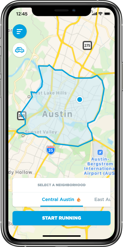 With the neighborhood model in place, Runners needed a practical way to choose which neighborhoods to run in. I designed a neighborhood selection interface in the Runner app, which was the first thing that Runners would see when beginning a work day. It allowed them to cycle through all of the available neighborhoods in a market, as well as view some additional information about those neighborhoods, such as which neighborhoods had higher demand (indicated by a flame icon next to the neighborhood title).