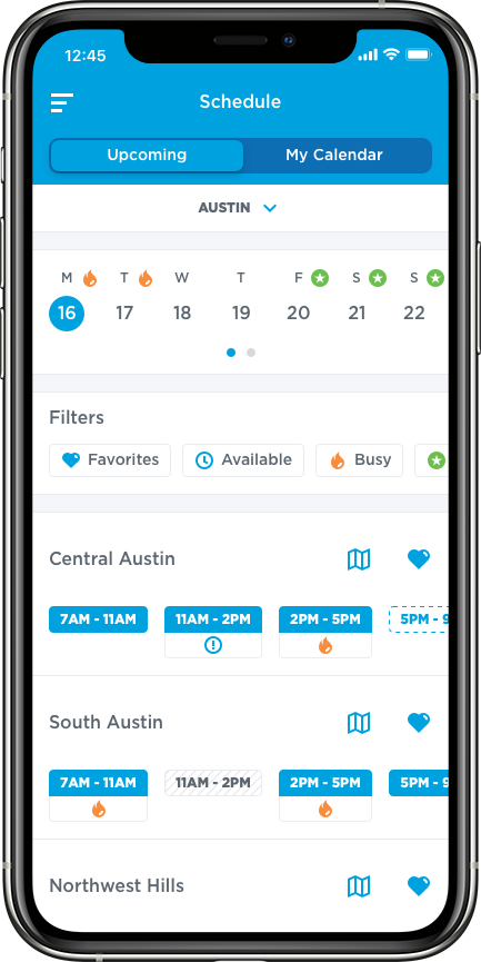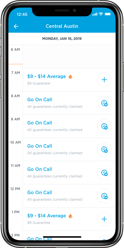 The interface for scheduling was fairly complex. It needed to represent several important pieces of information in a small form factor; namely, the current scheduling availability of specific times in specific neighborhoods, times that had higher demand than others, and times that had bonus amounts attached to them.