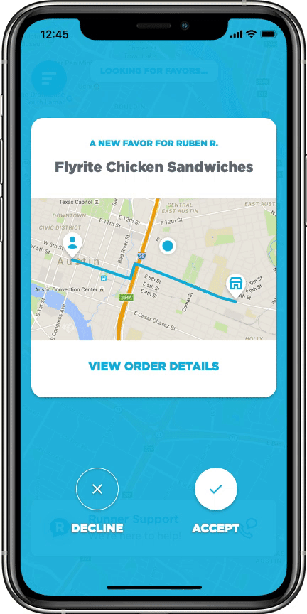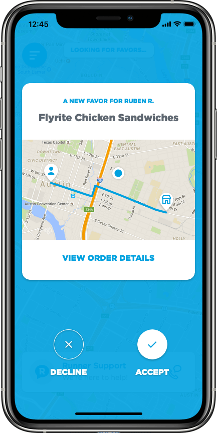When a Favor was presented to a Runner, a modal interface appeared that showed some basic information up front - the merchant, the customer, and a map showing the merchant’s location, the customer’s location, and the Runner’s current location. If the Runner wanted to see more details about the order, they could tap “View Order Details,” which would expand the modal to a state with more information about the Favor. In order to dismiss the modal, the Runner was required to either accept or decline the Favor via two buttons at the bottom of the screen.