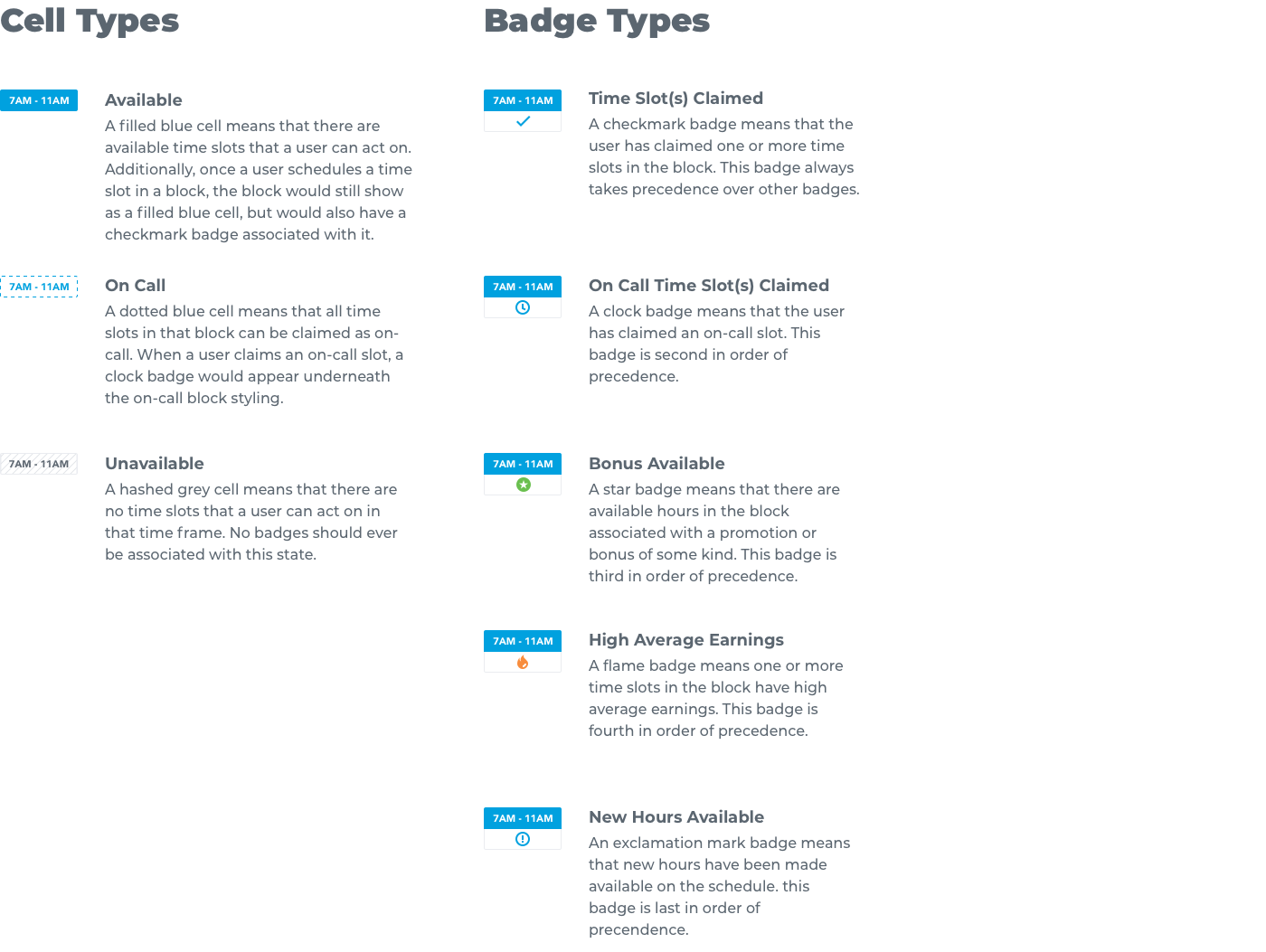 Here’s a more detailed breakdown of the visual design legend for time block cell and badge types: